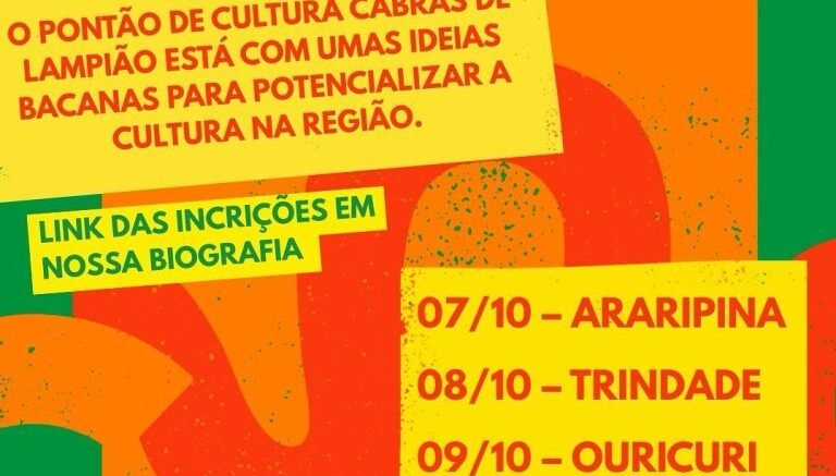 O Pontão de Cultura Cabras de Lampião, de Serra Talhada, realizará através dos seus agentes cangaceiros da cultura, oficinas técnicas e práticas destinadas para artistas e produtores, aberta ao público, completamente gratuitas. As atividades acontecerão no Sertão do Araripe, nesta semana, no período de 07 a 10 de outubro, nas cidades de Araripina, Trindade, Ouricuri e Bodocó.