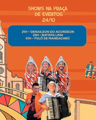 A programação desta sexta traz grandes atrações da música nordestina. Às 21h, Genailson do Acordeon abre os shows com o melhor do forró pé de serra. Às 23h, Batista Lima sobe ao palco com seu repertório romântico e envolvente. Para fechar a noite, à 1h da madrugada, Fulô de Mandacaru promete animar a plateia com muito xote, baião e sucessos do forró moderno.
