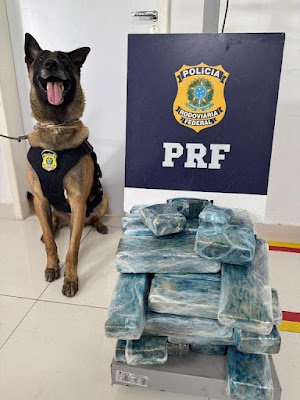 Polícia Rodoviária Federal (PRF) apreendeu, nesta segunda-feira (24), 26 kg de maconha durante a abordagem a um ônibus interestadual no km 830 da BR-116, em Vitória da Conquista (BA). A ação contou com o apoio do cão farejador Messi, que localizou o entorpecente dentro de uma mala.