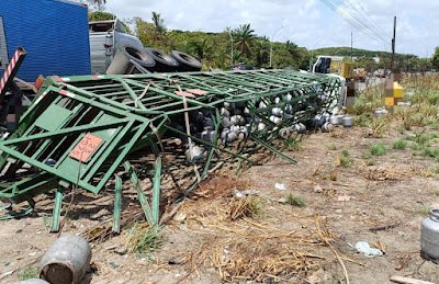 Caminhão de gás tomba na BR-101 e carga é saqueada em Milagres