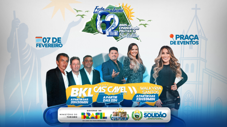 O município de Solidão realiza, no dia 7 de fevereiro, a programação comemorativa pelos 62 anos de Emancipação Política. As atividades acontecem na Praça de Eventos e incluem apresentações musicais abertas ao público.