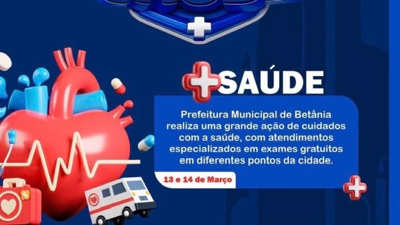 A Prefeitura de Betânia, por meio da Secretaria Municipal de Saúde, realiza nos dias 13 e 14 de março a Feira da Saúde, uma ação voltada à ampliação do acesso da população a atendimentos especializados e exames gratuitos. A programação acontecerá no Centro de Especialidades e em São Caetano, com início às 8h, contemplando diferentes serviços de saúde em pontos estratégicos do município.