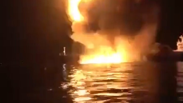 A televisão estatal iraquiana exibiu imagens de um grande incêndio em um navio.